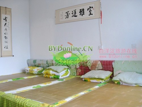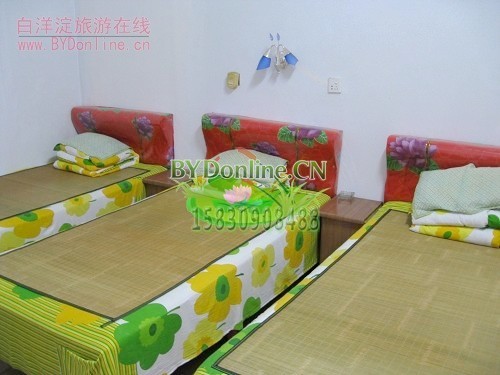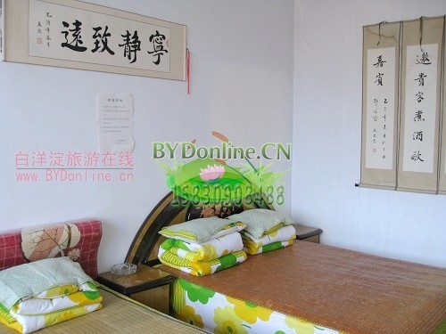 【第二種住宿】我們農家院最大的特點就是潔凈衛生。網站預訂價:雙人標準間,100元一間(周一至周 四),120元一間(周五六日、端午節、十月一),按間收費。室內為兩張獨立的單人床,并在一起就變成了一張雙人床,如果孩子不太大的話, 一家三口住在一起也可以。室內條件為全新格力空調二級能耗,彩電、閉路電視,太陽能熱水器24小時提供熱水,馬桶坐便器,洗臉池。有男用拖鞋和女用拖鞋各 一雙,不提供一次性洗漱用品,如果需要可以花錢代購。 我們的農家院,住宿和吃飯在一個地方,前面飯店,后面住宿,飯菜標準為早餐一人8元錢,管飽。正餐點餐大約平均每 人30元左右,以白洋淀農家特色野生魚蝦等為主。,現吃現殺,絕對新鮮。以上價格不含發票,要正規發票請加稅點8.5%,多要多開。夏天到來,在有蚊子的時候,免費提供電蚊香。為了您節省費用,可自備酒水。可在本農家院自助燒烤,設施自備,不收費。可自帶釣具,門前碼頭釣魚,不收費。打造白洋淀誠信旅游,明碼標價,言而有信,量力消費。網站說什么樣兒,實際就是什么樣兒。白洋淀旅游老字號——白洋淀在線,竭誠為您服務。
