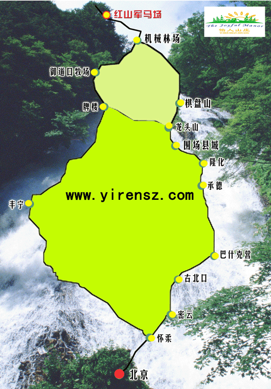 走懷柔--豐寧---圍場牌樓(鄉)--御道口牧場--機械林場---紅山軍馬場. 北京-木蘭圍場·怡人山莊路線圖
